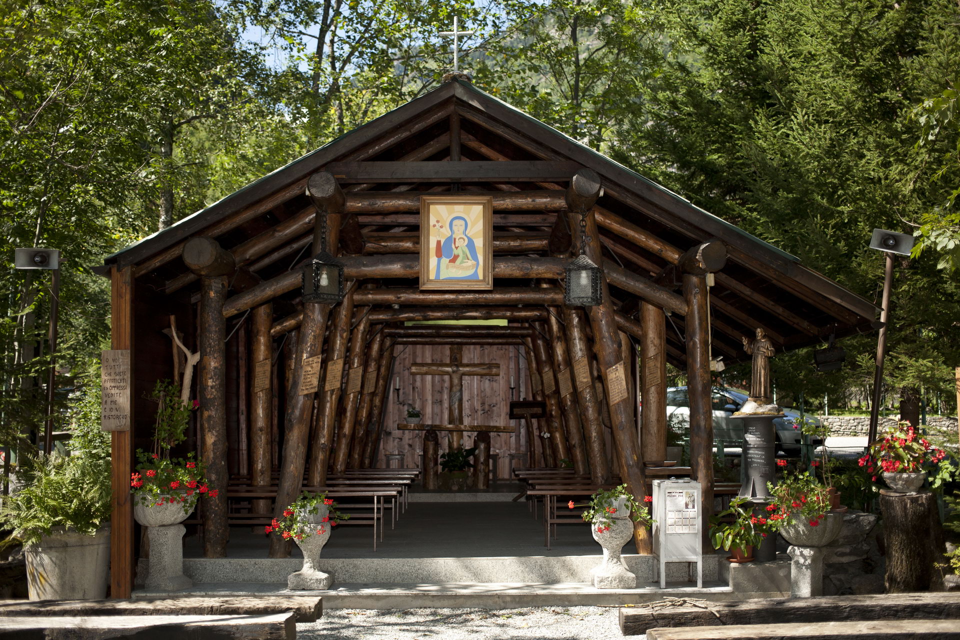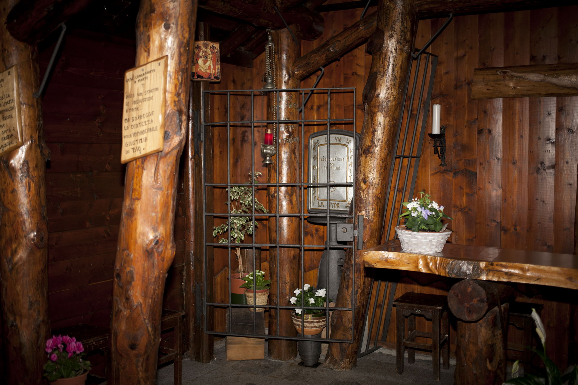 La chiesetta dei minatori. È l’agosto del 1978. Una grave alluvione colpisce la zona e causa il crollo della galleria sul tratto Domodossola-Iselle. Decine di operai e minatori lavorano instancabilmente per mesi per ripristinarla. Il 4 dicembre il cantiere è in festa, è Santa Barbara, protettrice dei minatori, e Padre Michelangelo si reca a celebrare la Messa. Il luogo è suggestivo e Padre Michelangelo è affascinato dal luogo che sembra una vera cappella e ne chiede il disegno. “Ma non è una cappella, è un’armatura della galleria!” gli rispondono. A maggio, finiti i lavori, al Treno dei Bimbi arriva una sorpresa, un dono dei minatori e così l’armatura della galleria è diventata la nostra chiesa.