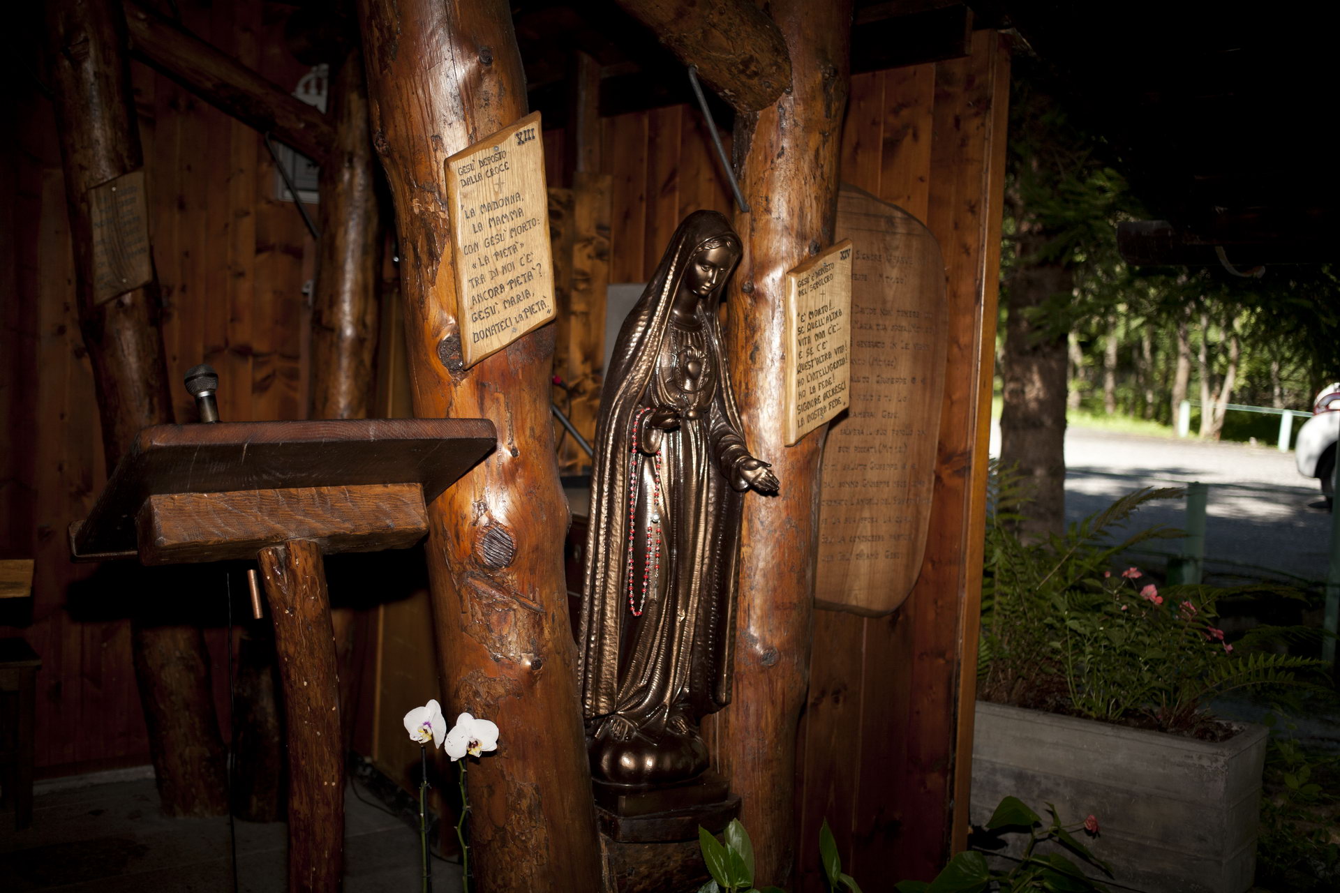 La mano protettrice della Madre, simbolo della speranza. Entrando alla chiesetta si incontra un piccolo monumento, è il Monumento del Capannone che nel febbraio del 1978 crollò sotto il peso di una forte nevicata. Del capannone originario è rimasto un groviglio di rottami sotto cui è, illeso, c’è Gesù Bambino, con la mano protettrice della Mamma.